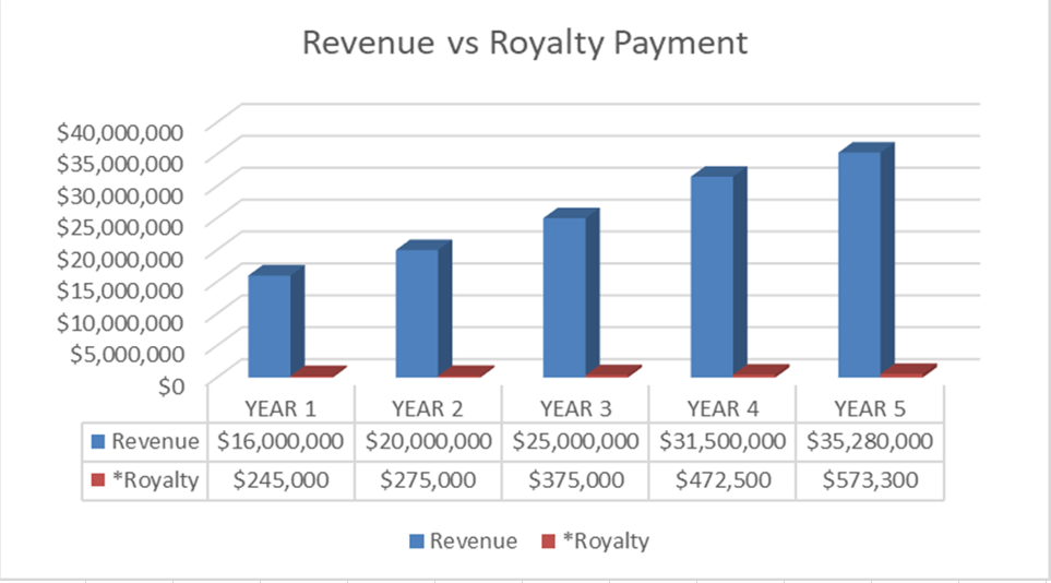 The monthly royalty payment range is fixed at 1% to 5% of the top-line revenue