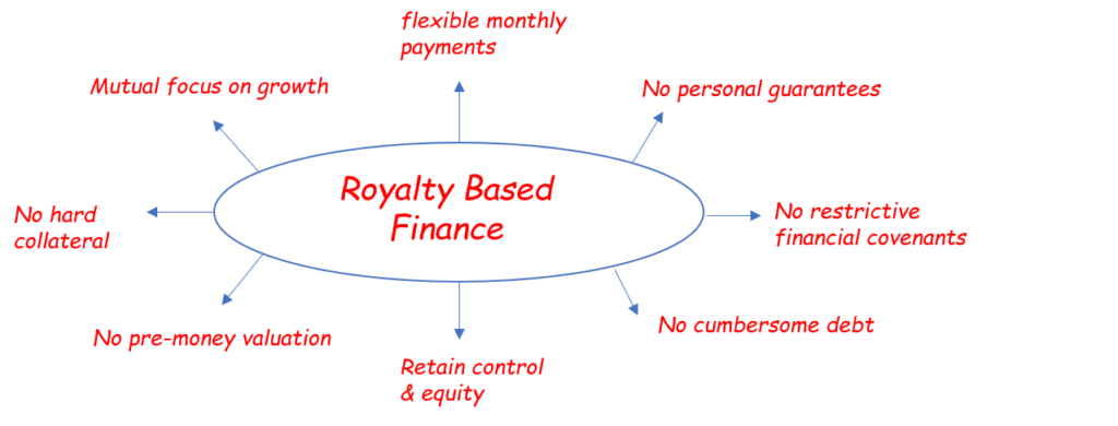 With Royalty Based Finance there are no personal guarantees and you keep 100% of your equity.  Flexible monthly payments are tied to revenue, you don’t give up board seats, and you maintain control of your company.